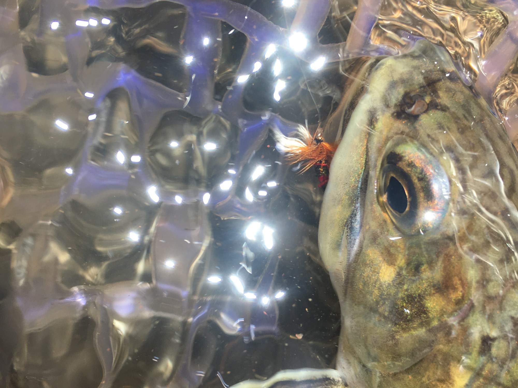 We moved through the meadow and back into the forest and that is when I spotted a solitary trout lazily eating just under the surface near a log. Connor was in the better position to cast but the fish was invisible to him. After several casts in the wrong spots (my poor directions) the stonefly drifted slowly over the fishes head and it came flying out of the water to inhale the large dry fly.