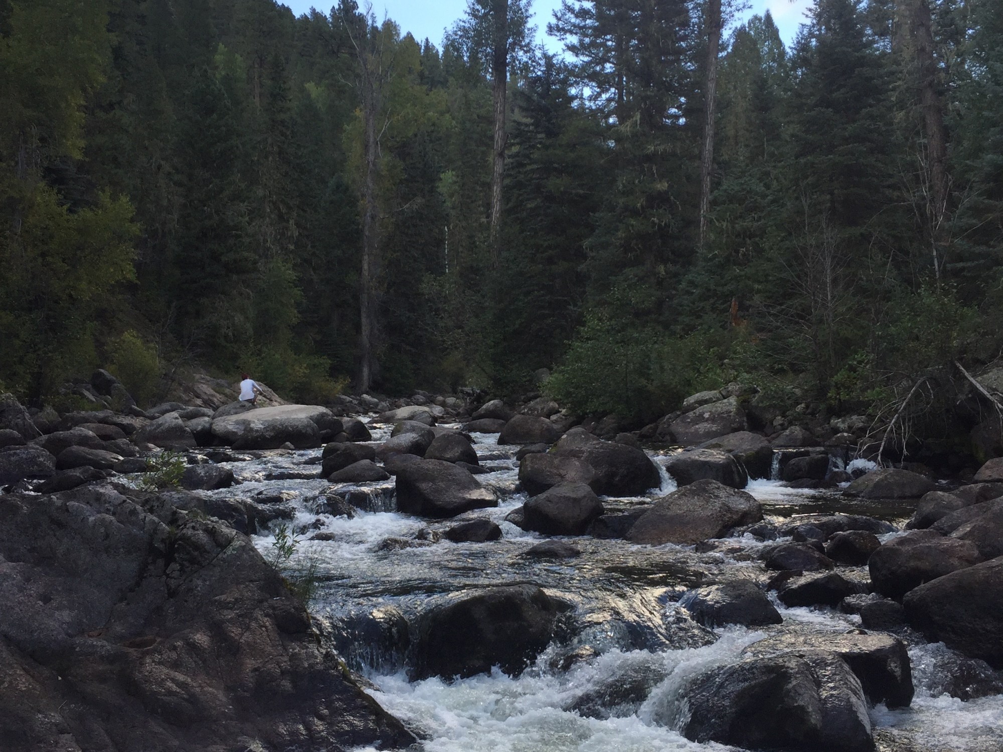 After stopping a few more spots to fish along the trail we made it to the river that the smaller creek fed. This river had incredible pocket water and was packed with fishy looking corners. We were so tired from the first stretch down we didn’t rig up the rods up for a few minutes, but eventually the excitement overcame the tiredness. We both ran a dry/dropper rig of a hopper to a hares ear and began checking all the likely looking spots. Before long Tanner had one on the end of his line after the fish mistook his hopper for the real deal.