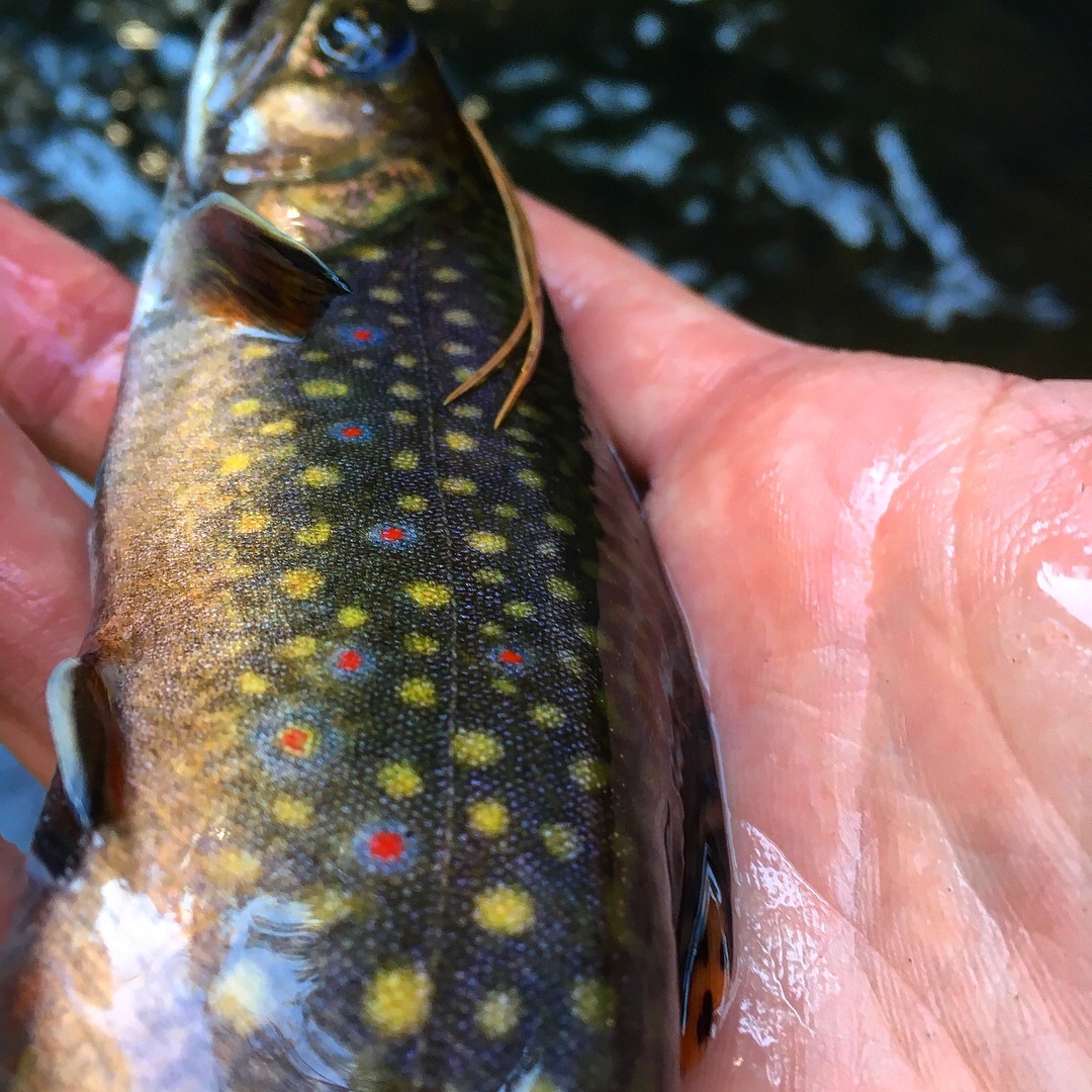 Finally a small brooke trout came to hand a little further down creek and in a pool covered in branches and overhead leaves. It was one of those cast where I’m thinking, ‘if I don’t catch a fish I’m going to be stuck’. Luckily this time my fly disappeared in flash and this small and dark colored brook came to hand!