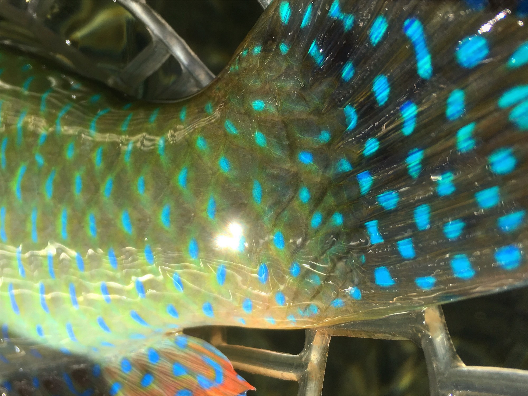 The fish had some significant teeth and did its best to destroy the pliers as I extracted the hook from its bony mouth. After a few photos we set this stunningly colored fish free and it darted back to the edge of the reef.