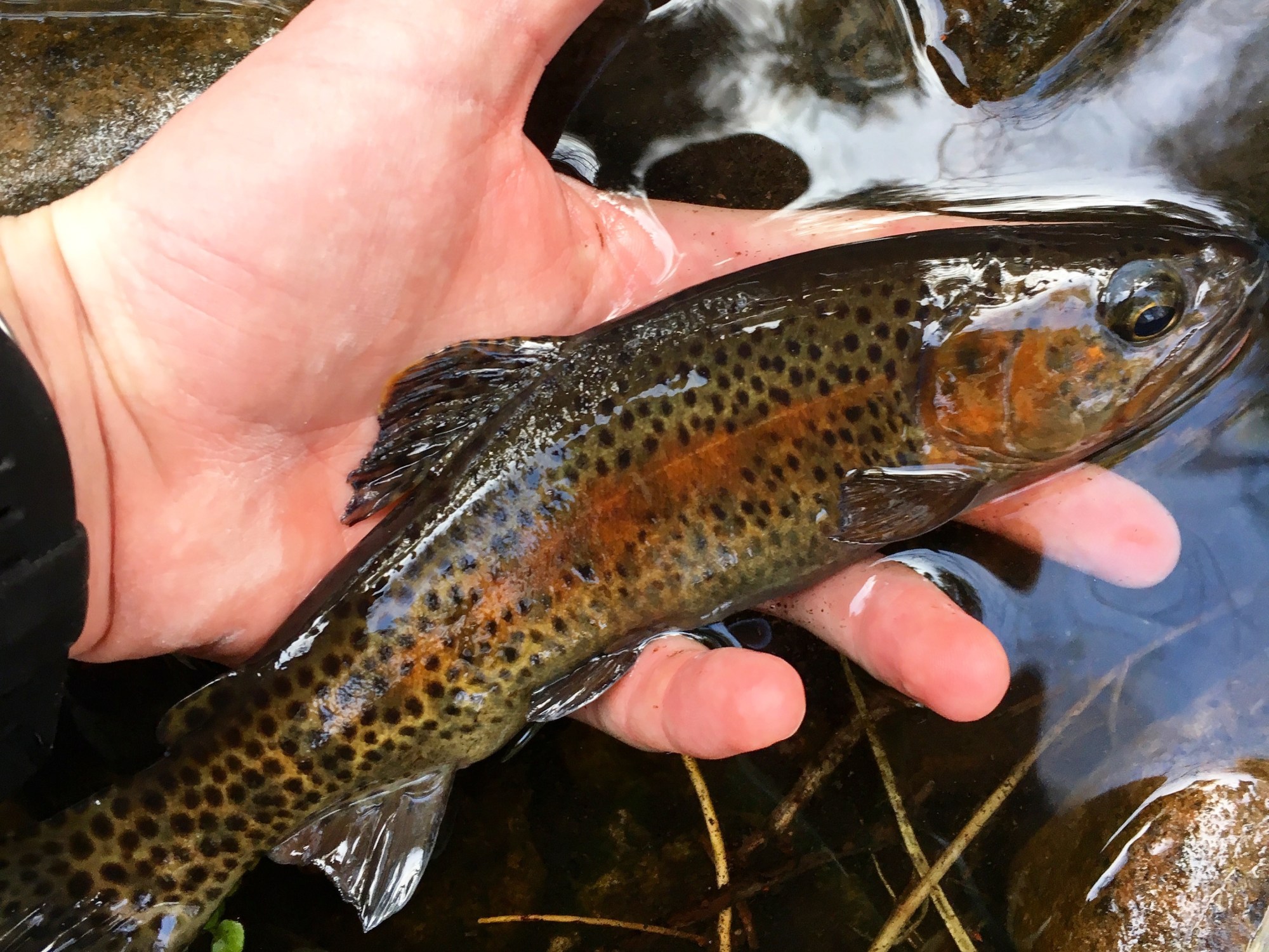 My best fish of the day came as a surprise when I cast a dry to the backside of a boulder. I couldn’t see the fly but I was waiting to see a ripple and hopefully it wouldn’t be too late to set the hook. The ripple came and I lifted my rod, there was a weight on the end and the weight did its best to swim back under the rock it had come from. I jumped to the other side of the creek and was able to pull the fish out from its hiding place. This fish had great color and was an energetic fighter.