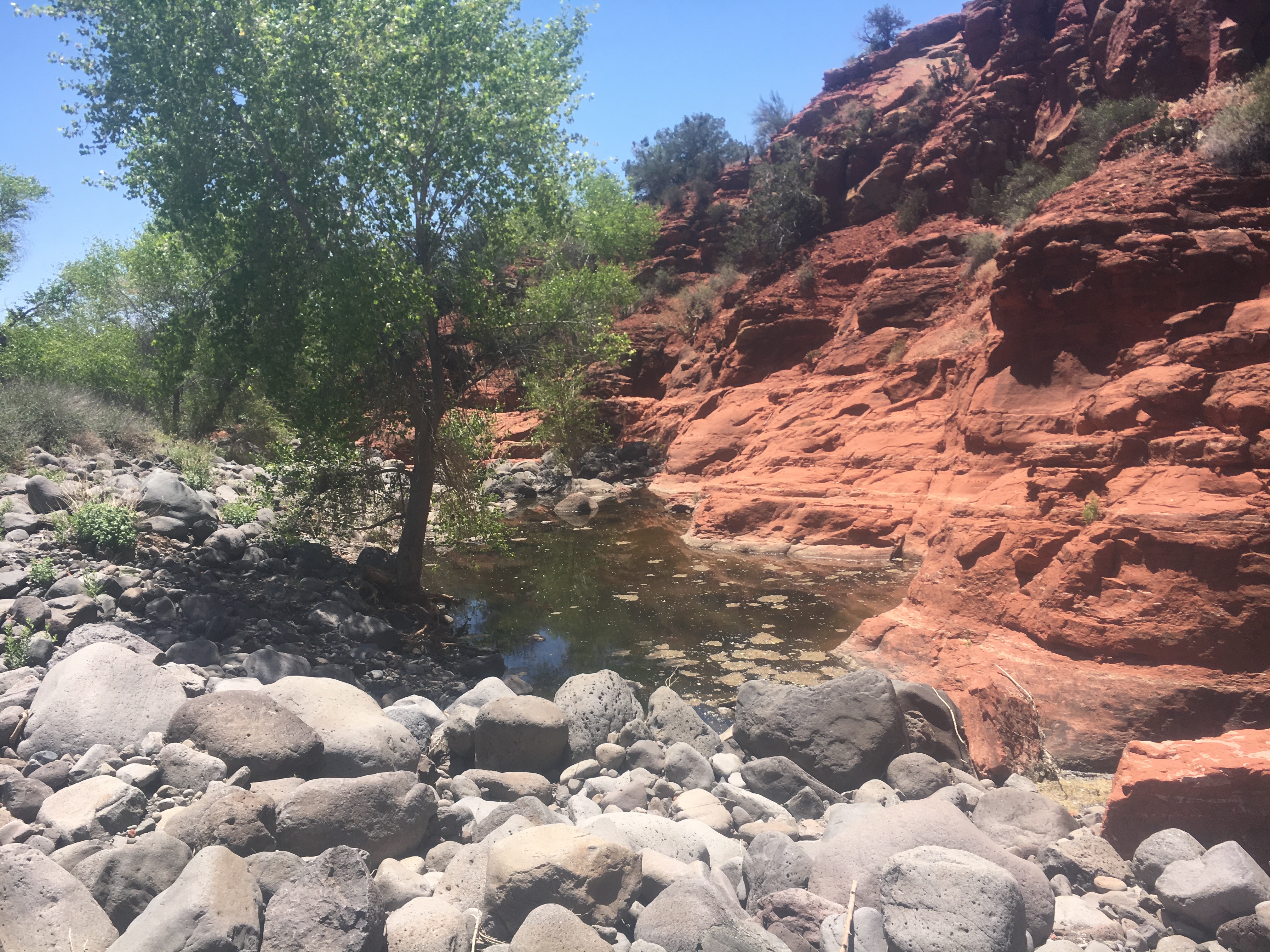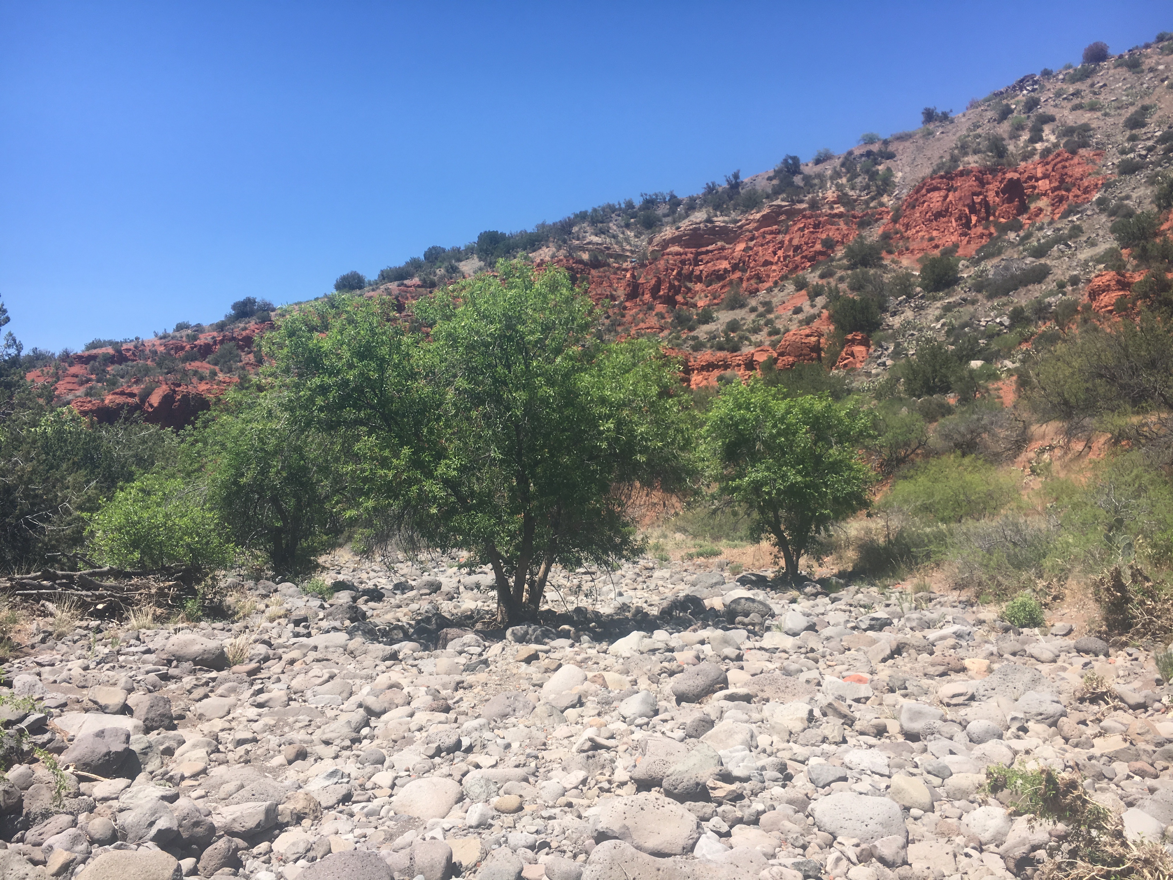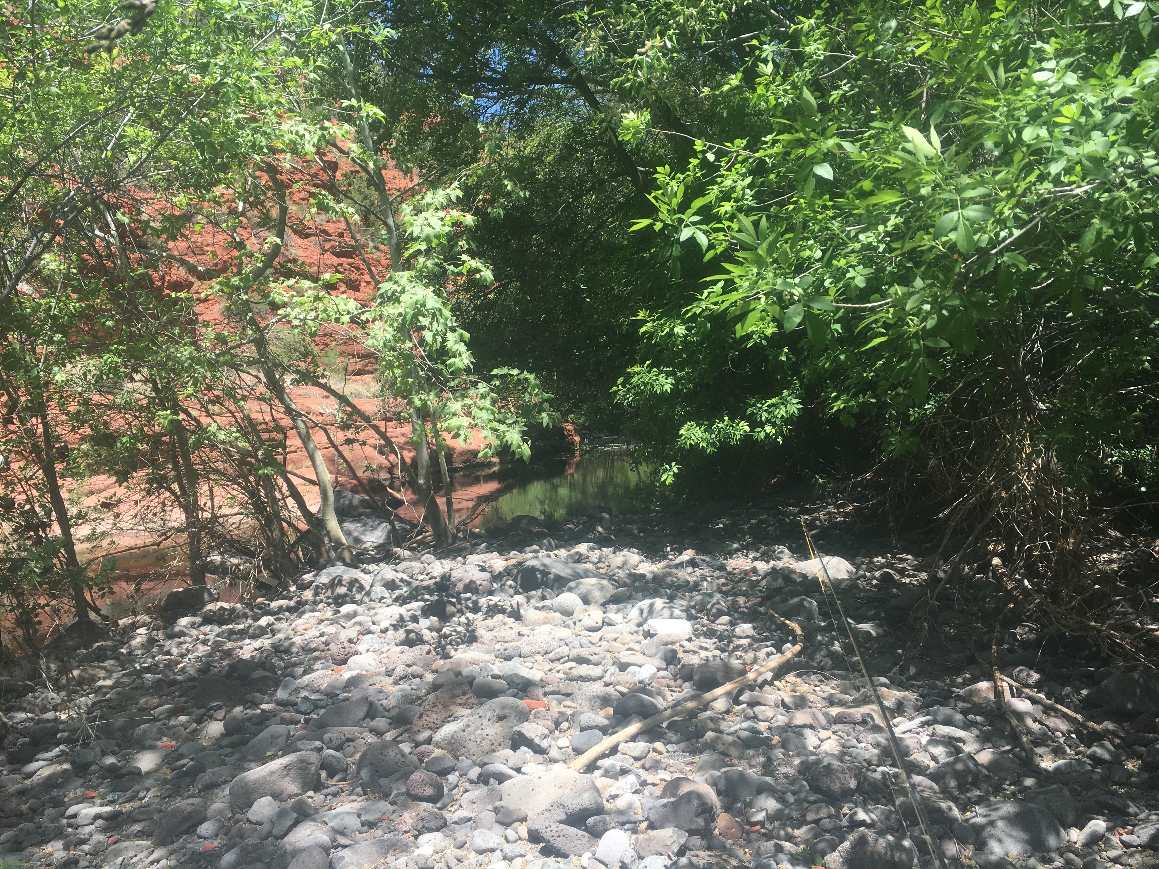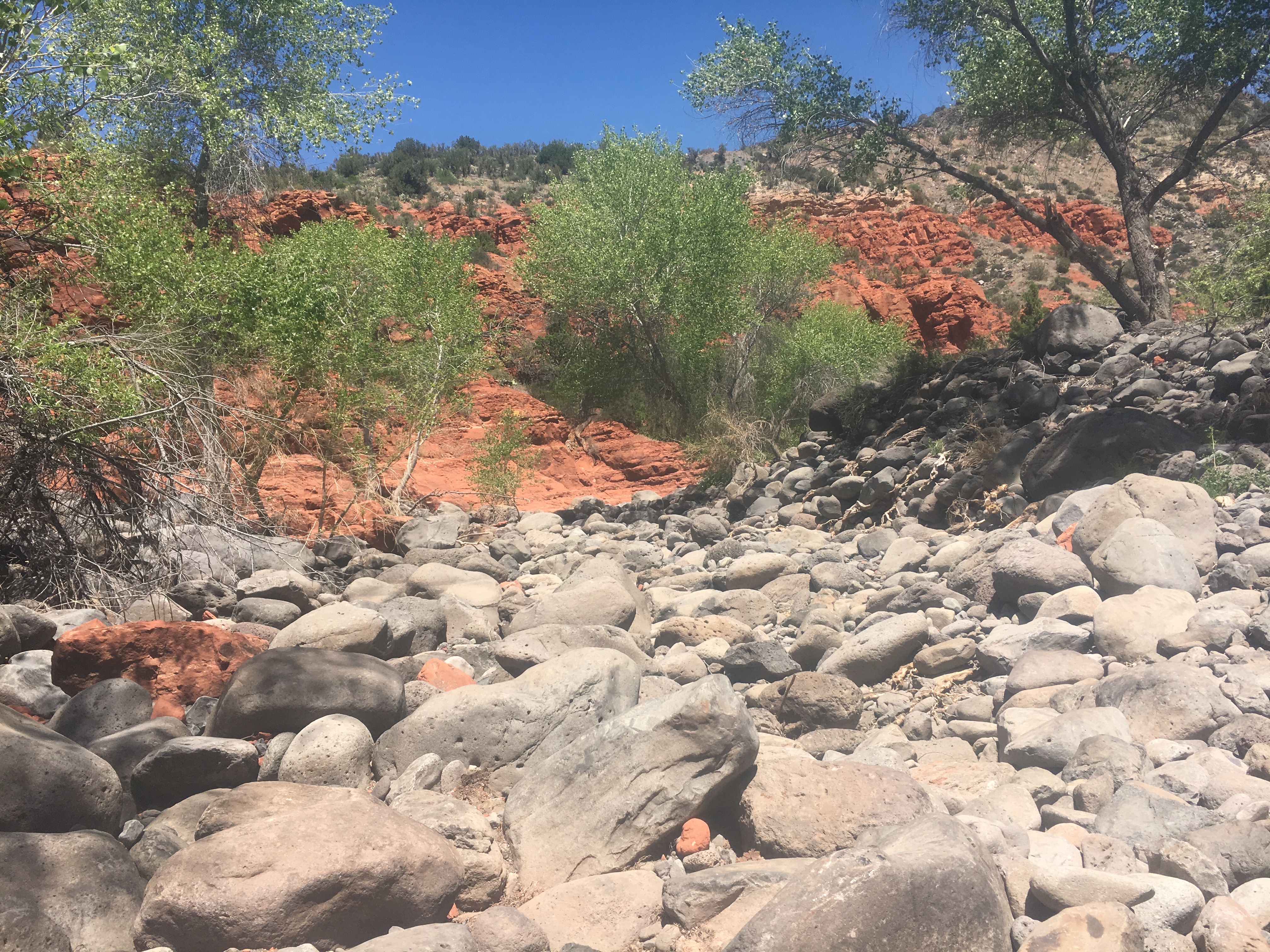 My most recent attempt at an ‘ephemeral’ creek fishing trip began how most of Arizona fishing trips do. A dry, boulder filled stream bed to scramble through. I saw a puddle here and there, but it has been a very wet winter so that did not necessarily mean success.