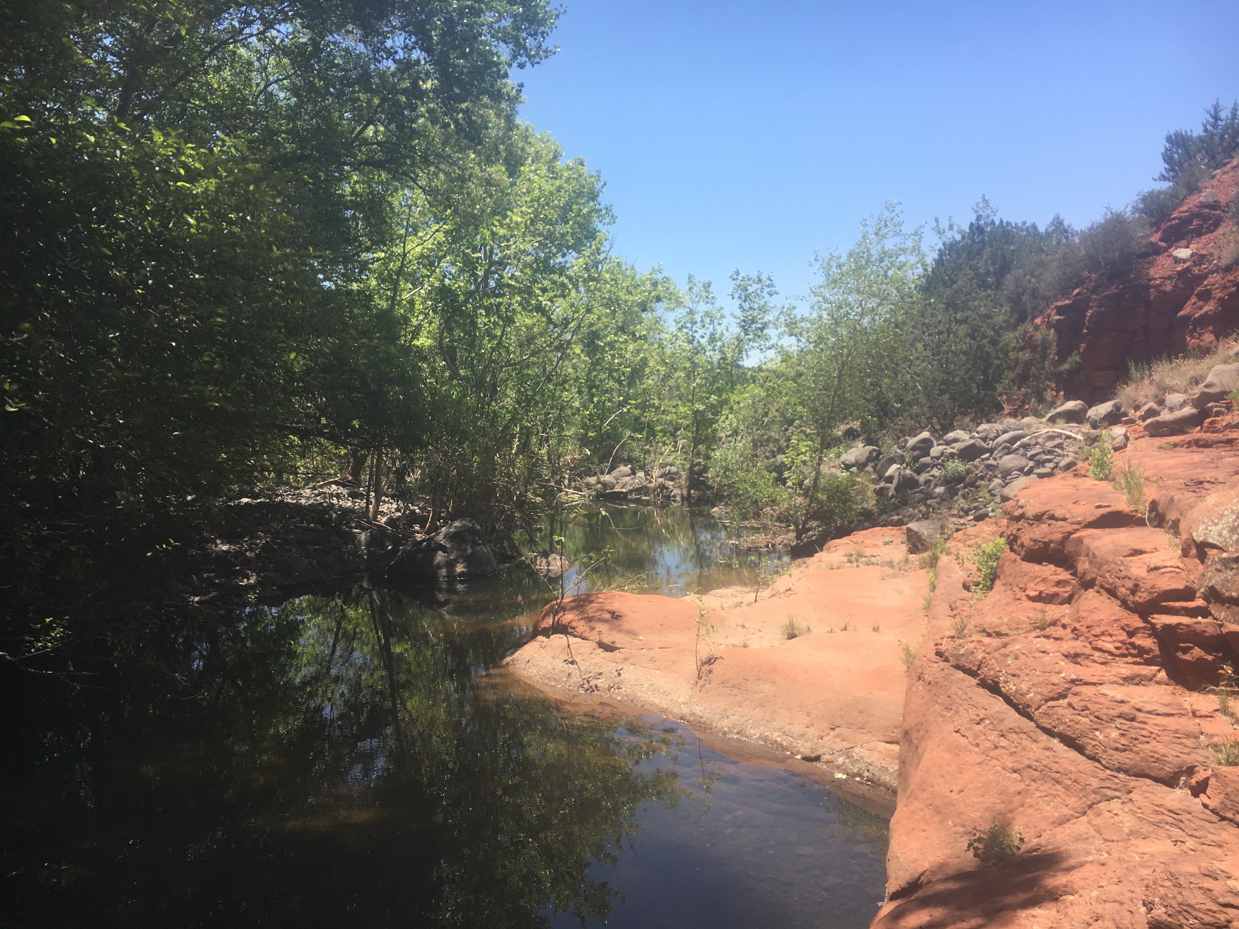 The first pool of significance I came to was nestled right along the sandstone wall. At first glance the pool appeared empty except for a few water beetles and a heavy covering of cottonwood seed fluff. I put a woolly bugger followed by a midge on the line and dropped it in the pool. More so because I’d hauled a rod up this canyon so I might as well fish it. The second cast hit the water and small fish darted out and tried to eat a bugger that was the same size as it was! Ah fish at last!