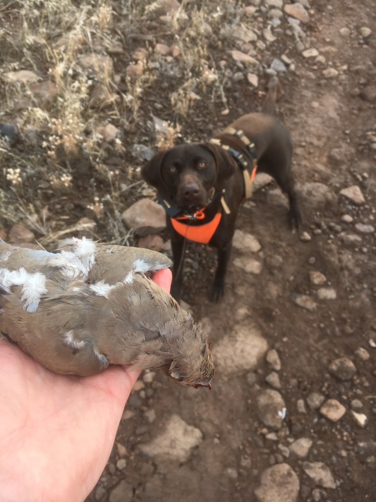 We broke the streak when Sage found some doves along the edge of a stand of juniper trees and I was fortunate enough to take one as they flushed from the trees. After a few shouts to refocus her on finding the bird she quickly had it in her mouth and trotted towards me with her tail wagging furiously. A very proud moment.