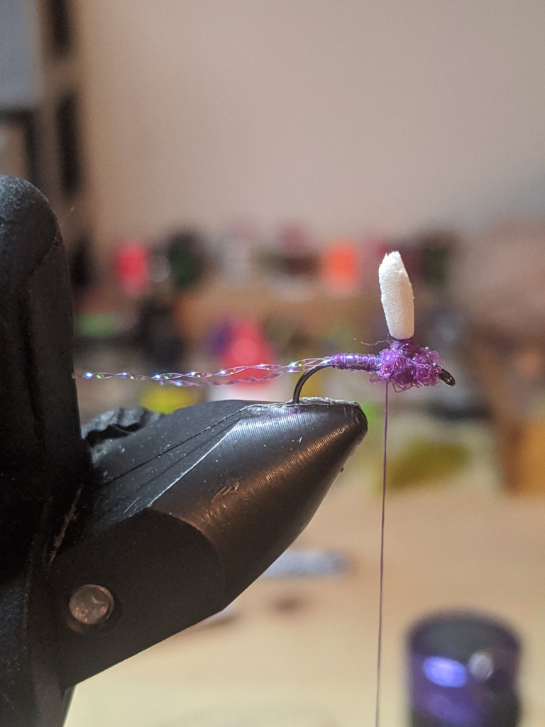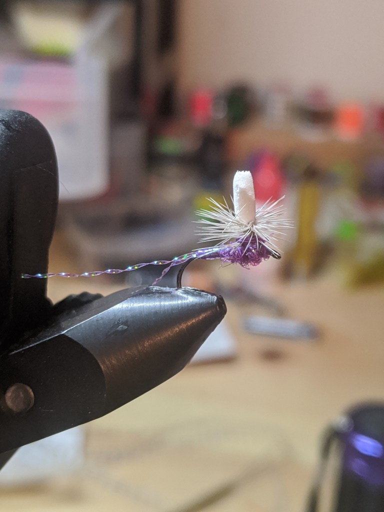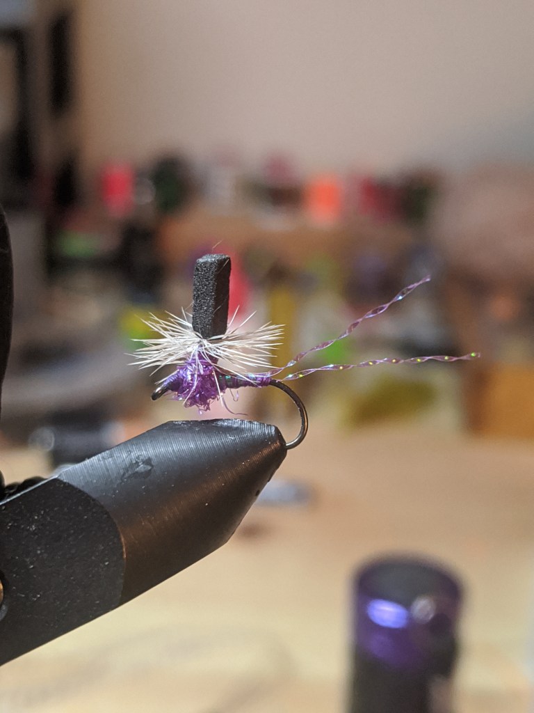 Here’s my shiny take on a classic pattern, the purple haze. Only real difference is wrapping the body in purple flash and swap the calf hair parachute for a foam one. Floats like a cork and shiny as it gets.