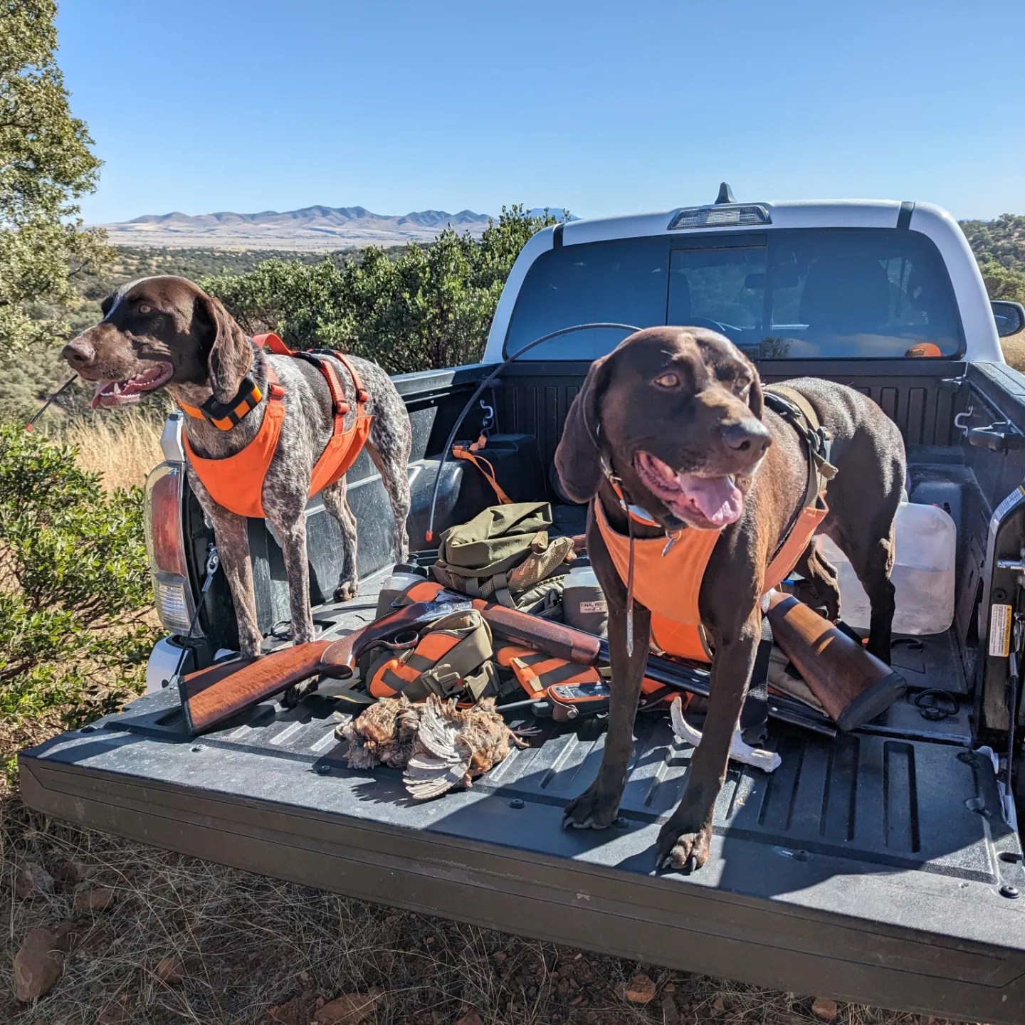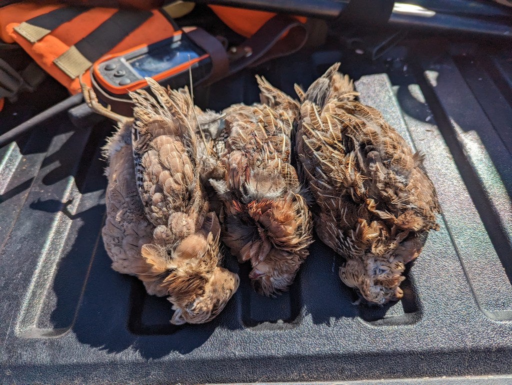With the first bit of excitement down my friends dog got real excited about a group of doves and we noticed that some of those doves were flying a lot more like quail. My first covey of Mearns that we actually got a good look at! The birds darted up valley and settled into the tall grass. I want to take a moment to say that I had heard that a dog was almost mandatory to hunt these birds and in my head I thought helpful yes, mandatory maybe not.. Well now I know, these birds will hold under a dogs nose or between your legs. The dogs did fantastic and we would have been lost without them. We found, bumped and shot at the covey multiple times moving up the valley with and handful of birds brought down between us. Both dogs performed incredibly, even if our shooting didn’t follow suit. It was a glorious day of points, flushes and shots. By the time we got back to the car a few hours later we decided it really couldn’t get much better and called it for beers and burritos.